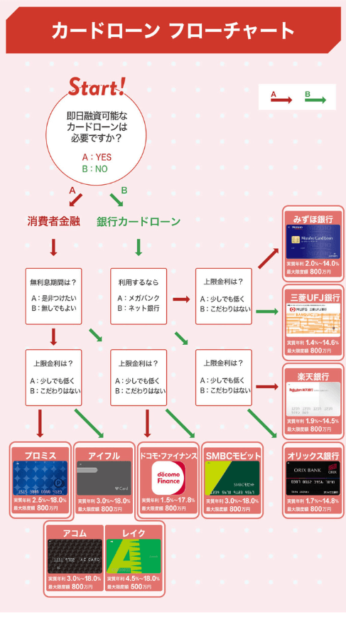 「どうしても即日融資のカードローン」が必要な場合には「消費者金融カードローン」が選択肢となります。「日数的に余裕がある」場合には比較的金利が低めな「銀行カードローン」から比較していきましょう。